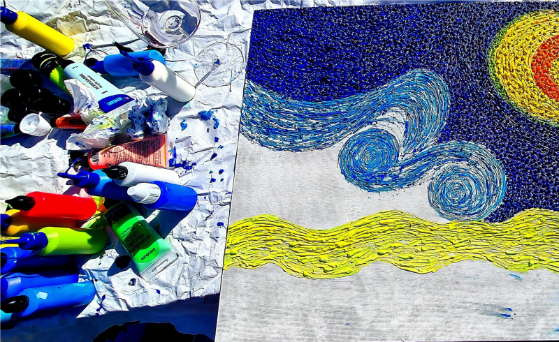 De Sterrennacht van Vincent van Gogh geeft Marcelino inspiratie. Marcelino schilderde vervolgens zijn eigen versie